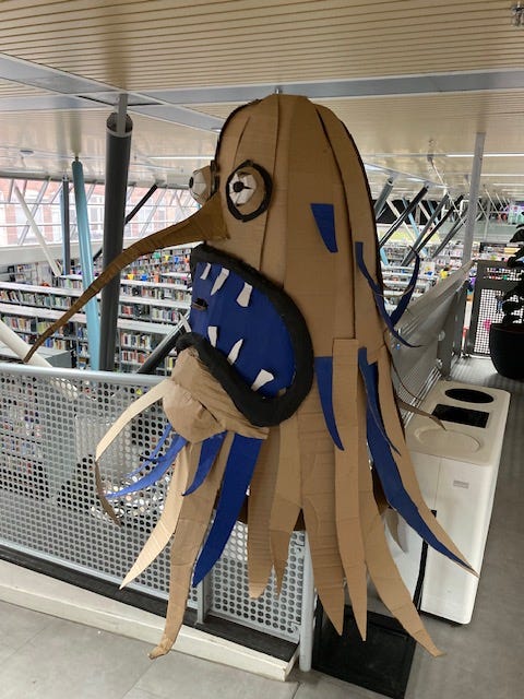 Meanwhile, our bookworm eldest (then 11) scoured the English language section and sat down under the glassy skylights on a comfy couch and lost herself in some dramatic tale of teenage mystery before making her way to the makerspace in the corner and designing a giant puppet out of cardboard.