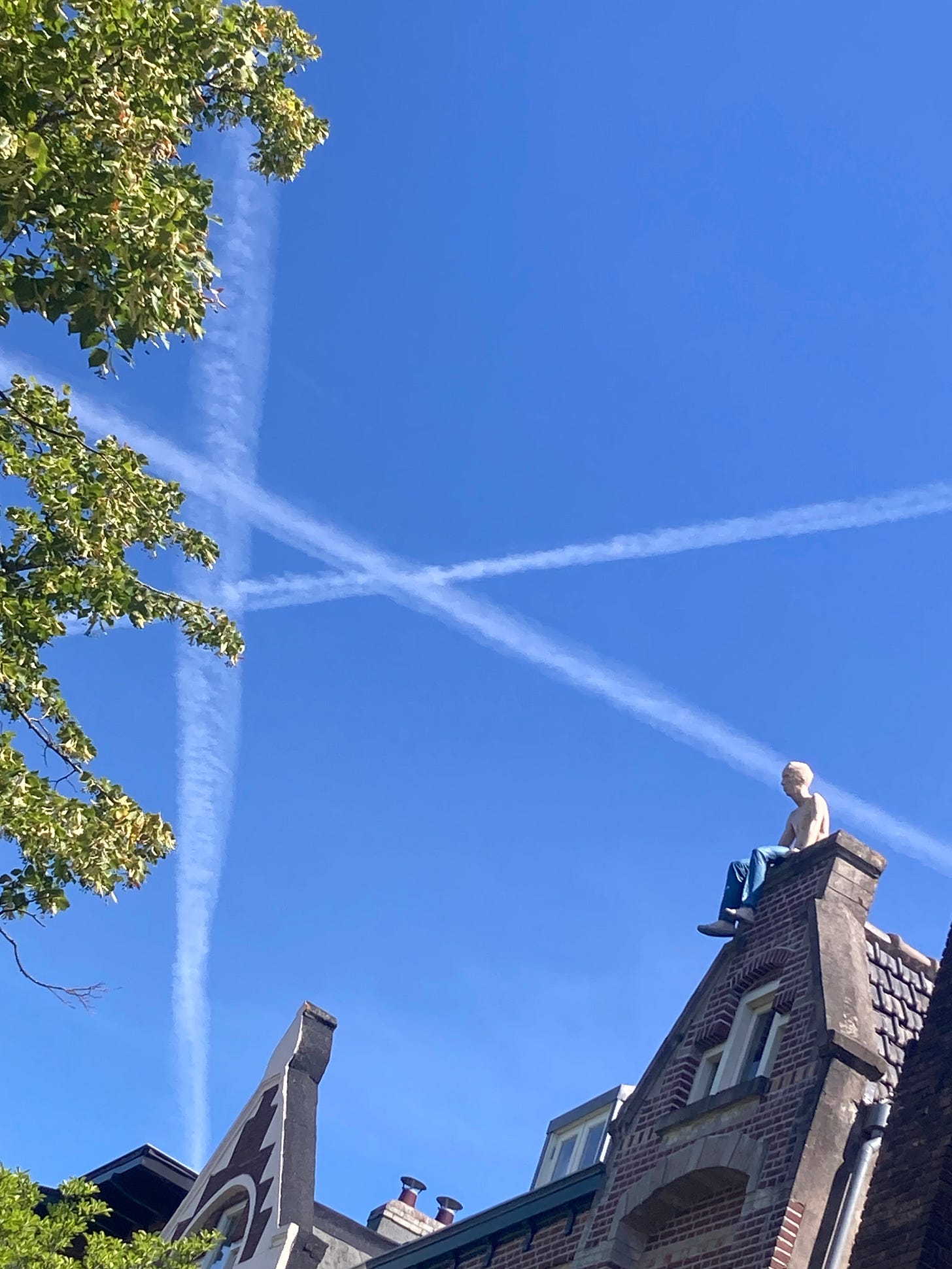 And so, this is how I found myself walking down a block last week watching an airplane skyline a pattern into the sky, compelling me to look up at a house I pass every single day, to notice a statue that I had been overlooking (or maybe it had just been installed?) was peeking there from atop the roof.